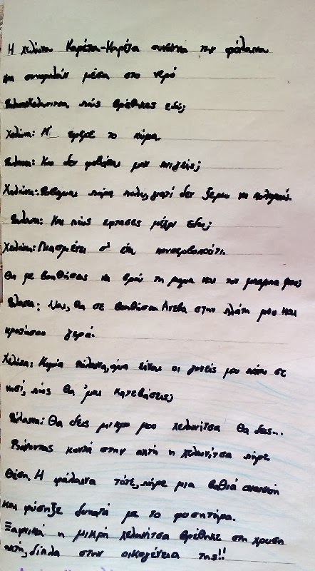 2η ομάδα: Γράψαμε ένα διάλογο ανάμεσα στο χελωνάκι Καρέτα -Καρέτα και σε ένα κονσερβοκούτι.Το χελωνάκι μας ,μόλις βγήκε από το αυγό δεν έτρεξε προς τη θάλασσα ,όπως συνηθίζουν τα χελωνάκια,αλλά εντυπωσιάστηκε από το Κονσερβοκούτι και έπιασε κουβέντα μαζί του.